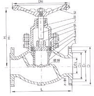柱塞式闸阀是由阀体,阀盖,阀杆,柱塞,导向套,密封环,手轮等零件组成(如图),当手轮旋转时,通过阀杆带动柱塞在导向套中上下往复运动,使柱塞端部斜锥面与阀座面完成阀门的开启和关闭功能。柱塞闸阀中柱塞与密封环采用过盈配合,通过调节中法兰螺栓预紧力,使密封环压缩所产生的倾向力与阀体中孔面及柱塞外圆密封从而磨损性高的无毒新型密封材料,所以密封可靠,经久耐用,从而提高阀门的使用寿命。柱塞式闸阀是根据原有的闸阀连接尺寸设计制造的,由于闸阀在使用过程中出现外漏,密封环带复性较差,使用寿命短等特点,本柱塞闸阀结合了柱塞阀的无泄漏优点和闸阀启闭快又耐高温高压的特点,成为一种结构新颖的无泄漏柱塞闸阀。