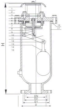 污水复合式排气阀原理与CARX复合式排气阀相同,只是将结构略作改动,即将阀体加高,杠杆机构稍微改动(如图)。这样控制部分降低,使污物只在阀体下部,不会缠绕上部排气部分机构,不影响排气,不致漏水,排气量与CARX型相同。