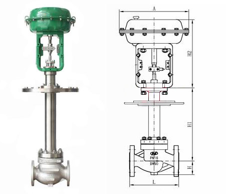 气动薄膜低温调节阀适用于介质温度-40℃~ -196℃(如液氧、液氮等)的低温、深冷场合,主要由多弹簧气动薄膜执行器与带长颈接管的阀体组成,采用长颈型上阀盖的作用,使填料处于常温下工作,并减少外界热能传入,为减少传递,长颈一般采用薄壁结构,具有良好的耐低温性,特别用于精确控低温气体、流体(如液氧、液氩等)的工艺参数保持在给定值。