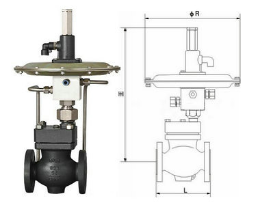 该阀采用大膜片执行机构输出力大稳定,对压力流量微小变化极其敏感,控制精度很高,阀芯采用单座流开(高进低出)设计,在阀盖处(和阀体连接处)安装有平衡膜片(起到阀前压力平衡,消除不平衡力)阀后压力经取压管进入薄膜执行机构,同薄膜执行机构调节弹簧相比较,压力达不到设定值(调节压缩执行机构弹簧)阀后压力则变大,反之则变小。
